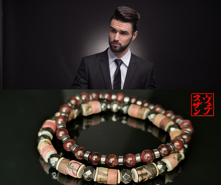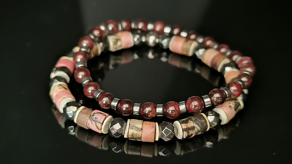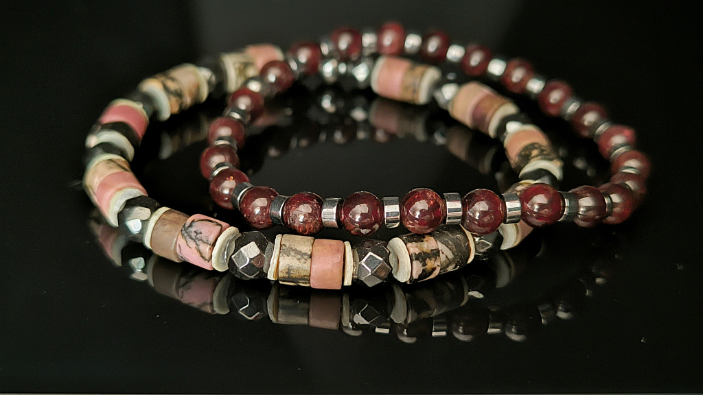 gránát karkötő férfiaknak, rodonit ásvány karkötő, hematit karkötő férfi ékszer, Monolith férfi karkötő, kézműves ásvány karkötő szett, természetes kő karkötő férfiaknak, férfi karkötő bátorságra, spirituális ásványékszer férfiaknak