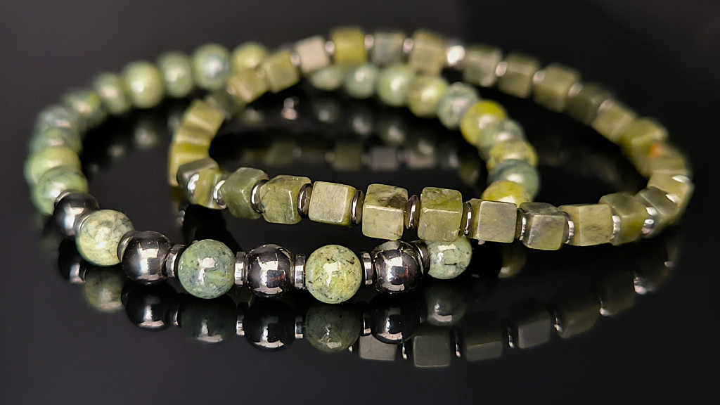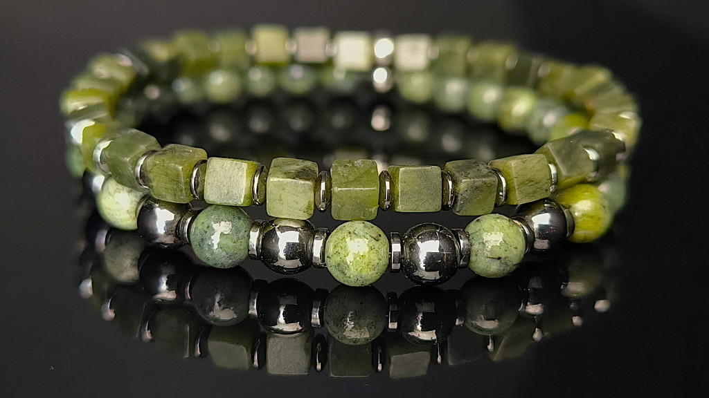 A hematit és antiallergén rozsdamentes acél kockaformájú elemei férfias, minimalista karaktert adnak az ékszernek, miközben kiemelik a zöld jade természetes ragyogását.