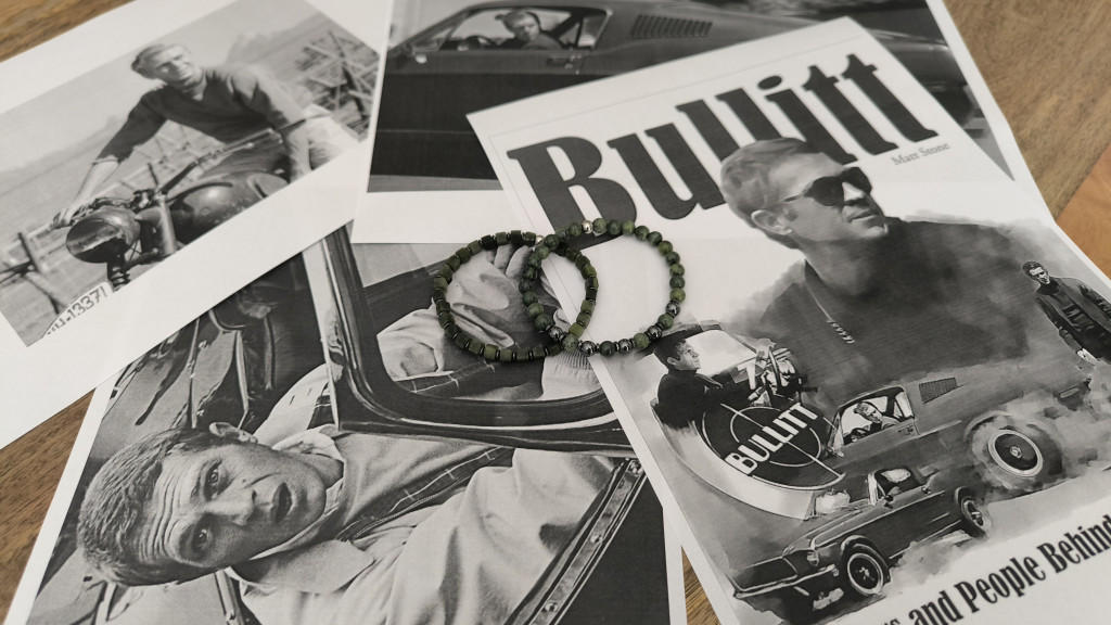 A karkötő központi ásványa a sötétzöld nefrit jade, McQueen ikonikus színe. Ezzel fénylett a Bullitt Mustang GT motorházteteje, és ebben a tónusban rendelte újrafényezni ritka Jaguar XKSS modelljét is. Ez a mélyzöld árnyalat nemcsak stílust, hanem erőt is sugároz.