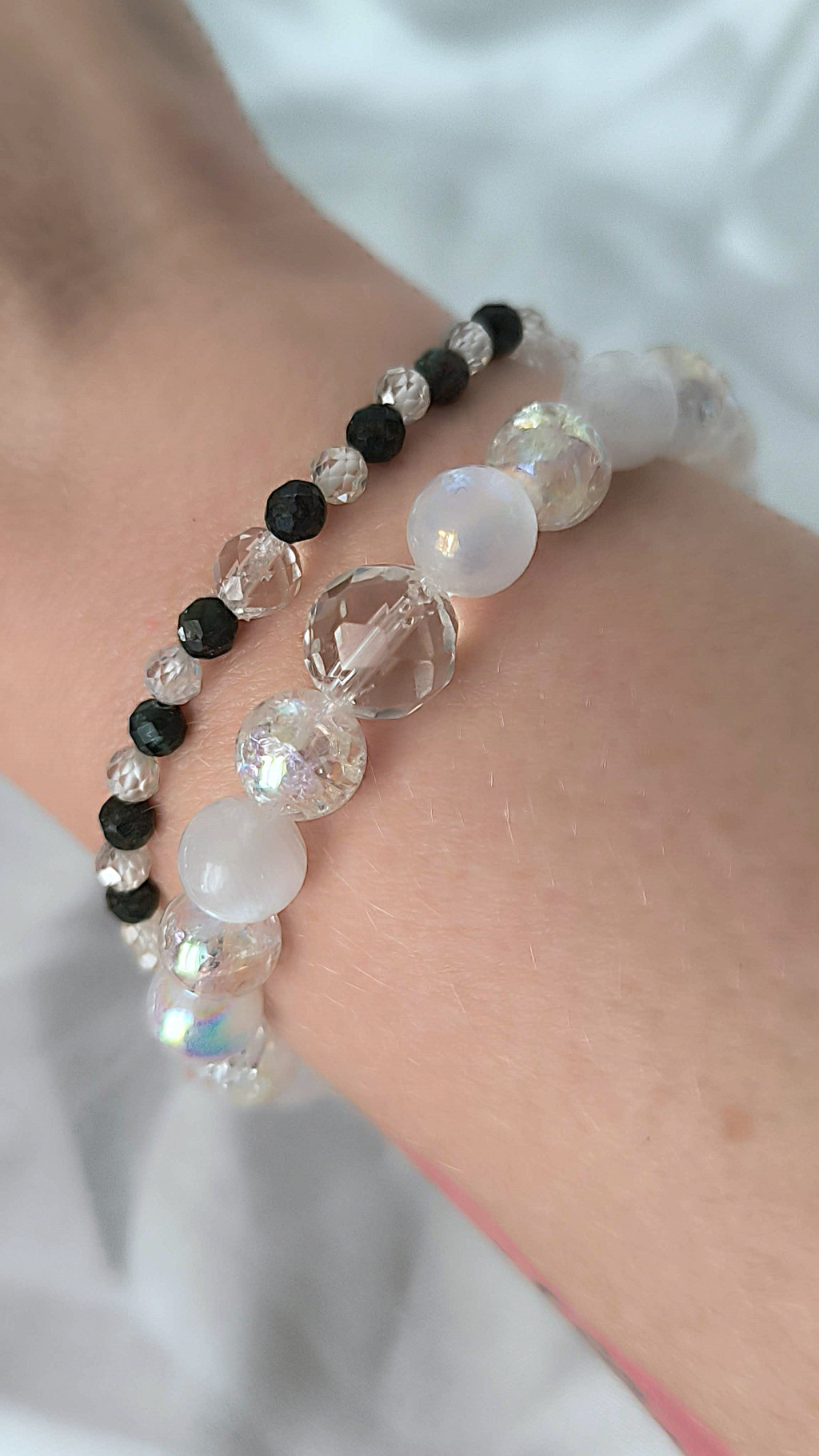 Őrangyal Karkötő – Angyal Aura Kvarc & Fehér Angyal Aura Szelenit & Fehér Szelenit + Kísérő Karkötő – Szerafinit & Cirkon (4 mm)