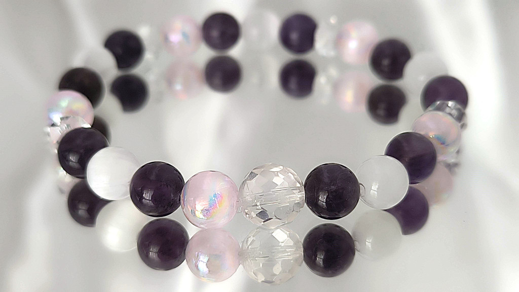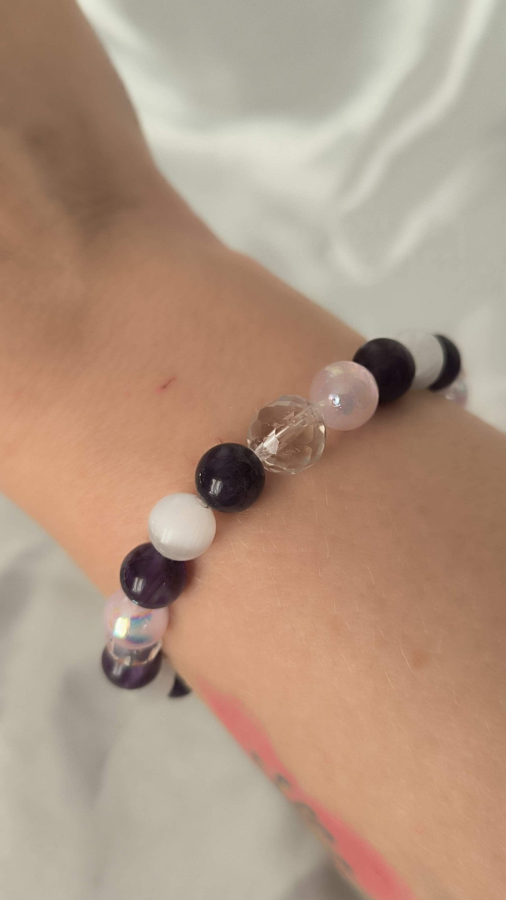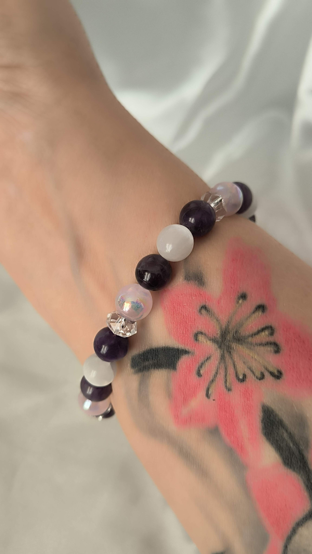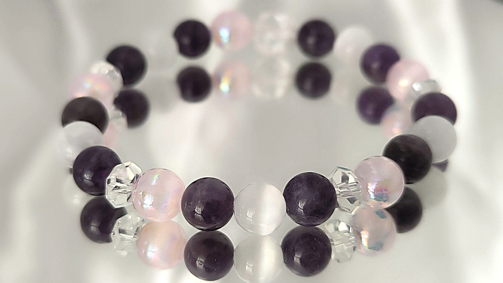 ametiszt karkötő, lila szelenit karkötő, aura szelenit karkötő, spirituális ásvány karkötő, meditáció karkötő nőknek, Garuda Ékszer Susan Végh, női angyal karkötő, belső béke ékszer, különleges kézműves karkötő, lelki védelem karkötő