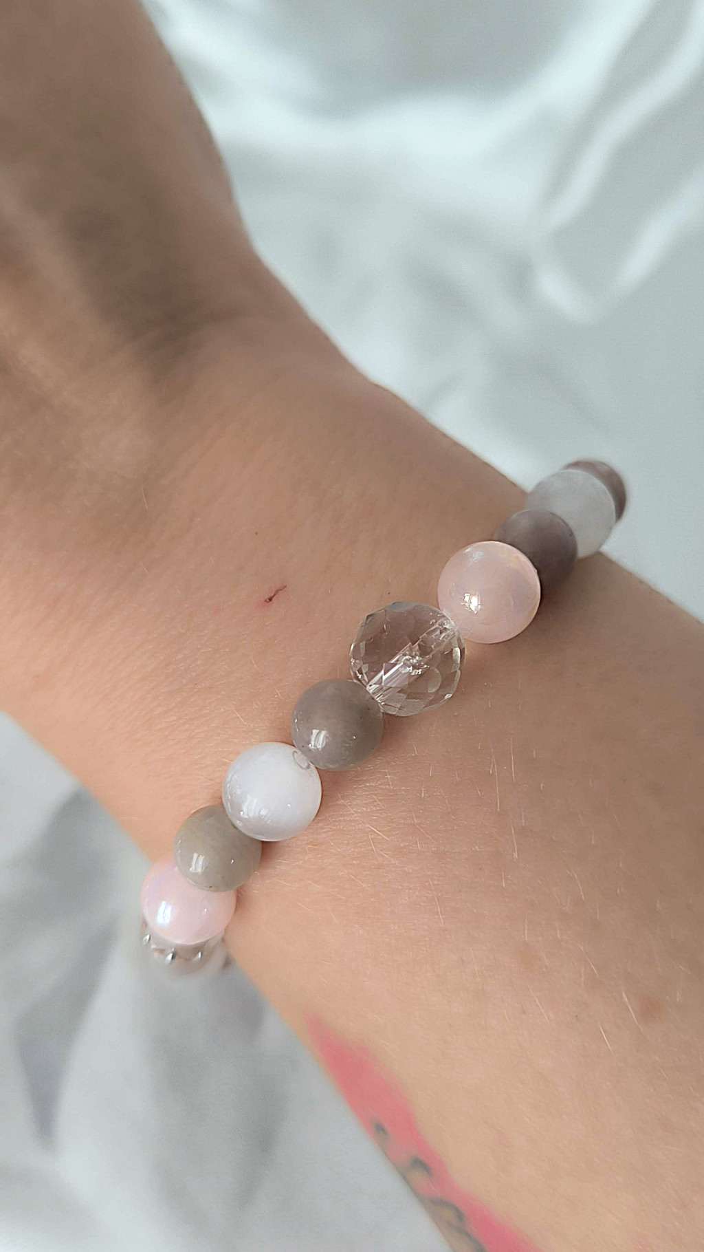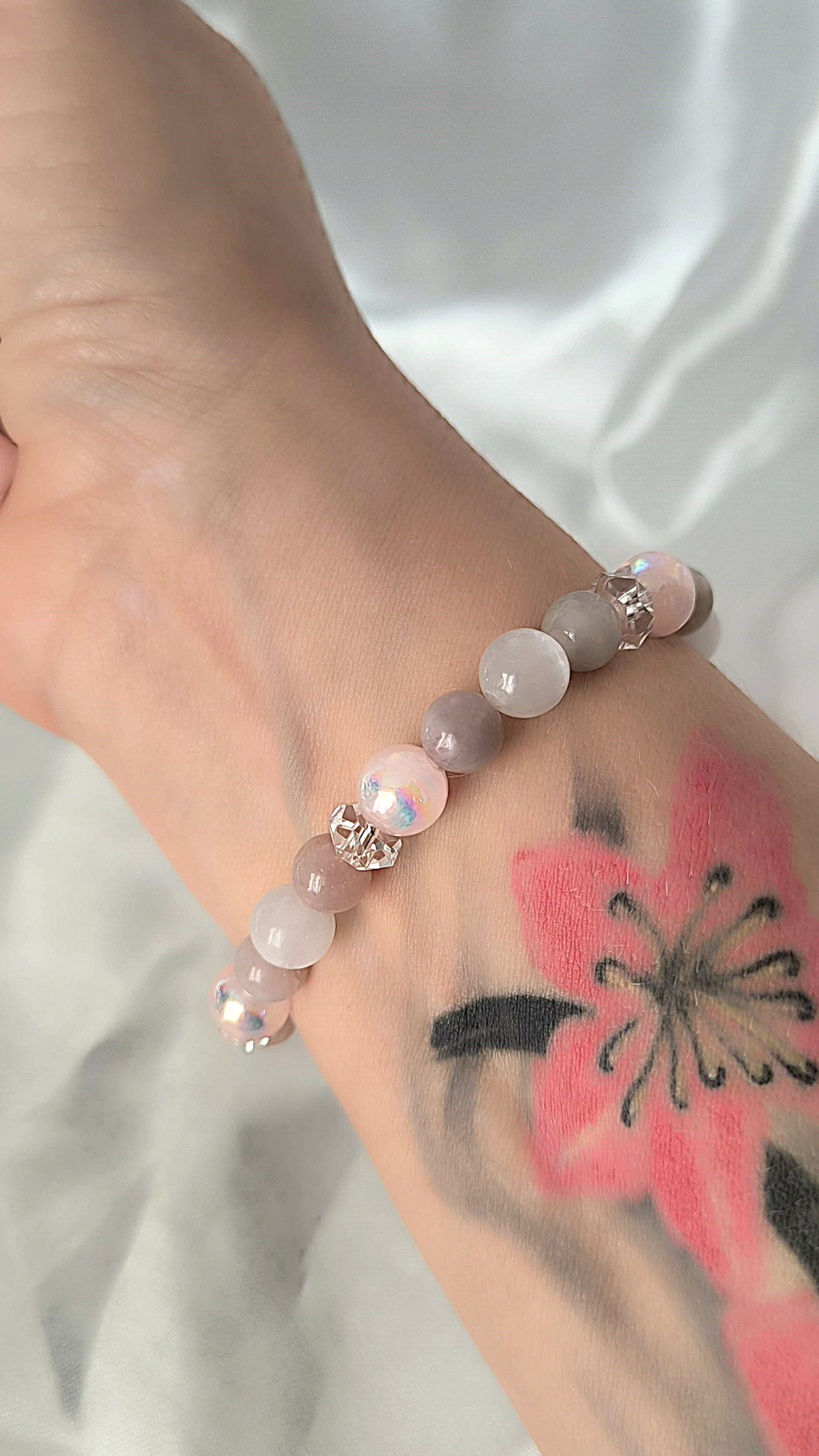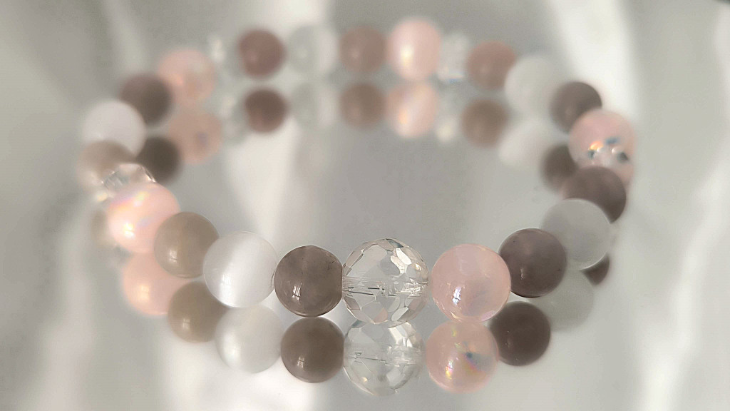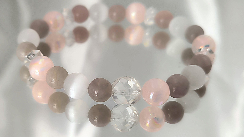 morganit karkötő, rózsaszín szelenit karkötő, hegyikristály ékszer, őrangyal karkötő, Garuda Ékszer Susan Végh, szeretet karkötő nőknek, különleges kézműves karkötő, lelki védelem karkötő
