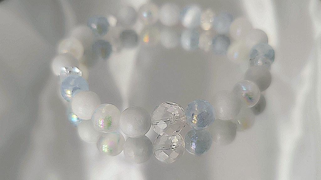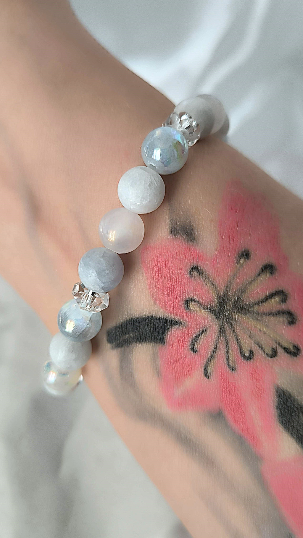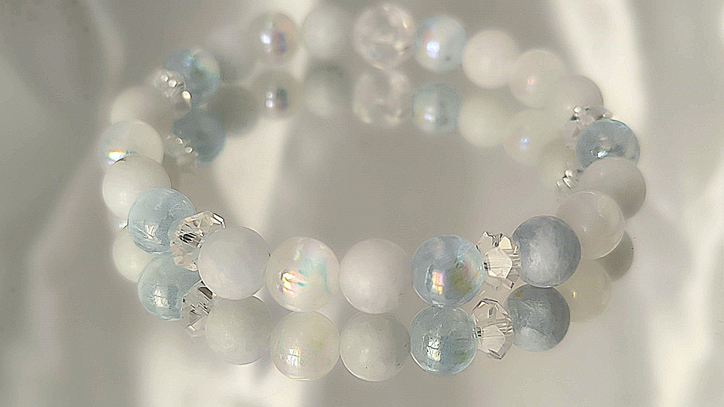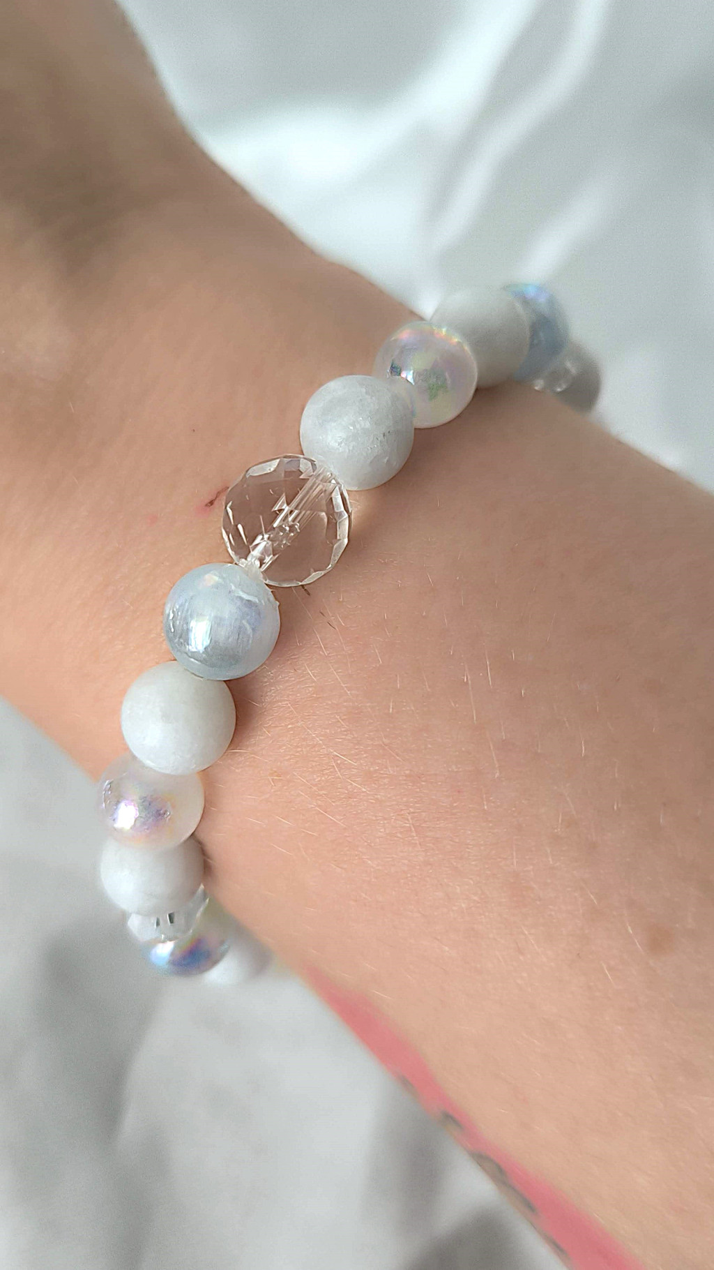 cölesztin karkötő, kék aura szelenit karkötő, fehér aura szelenit, őrangyal karkötő nőknek, spirituális karkötő, Garuda Ékszer Susan Végh, különleges kézműves karkötő, lelki védelem karkötő