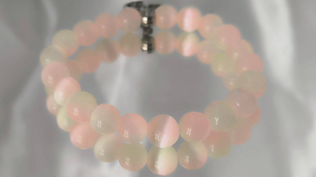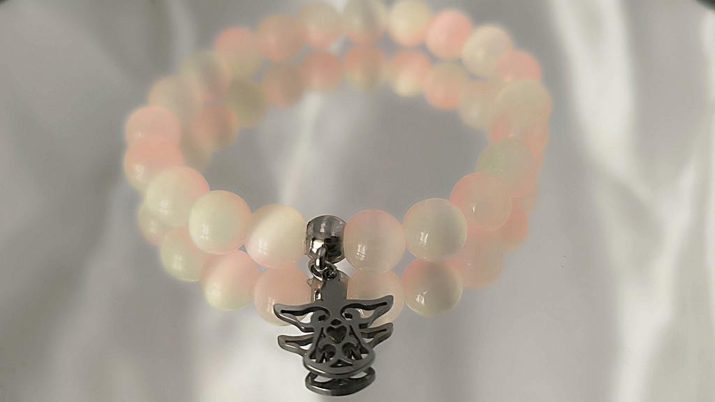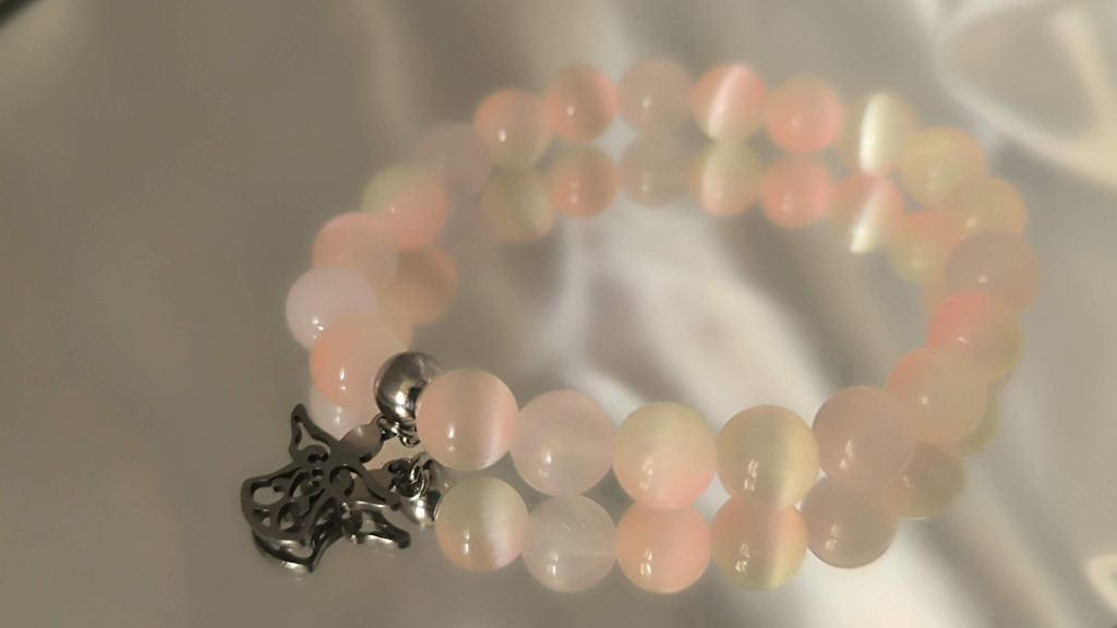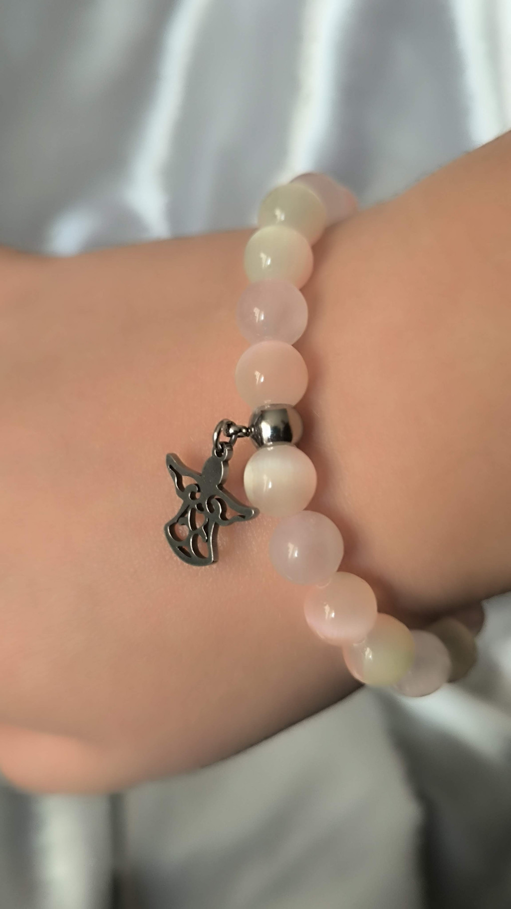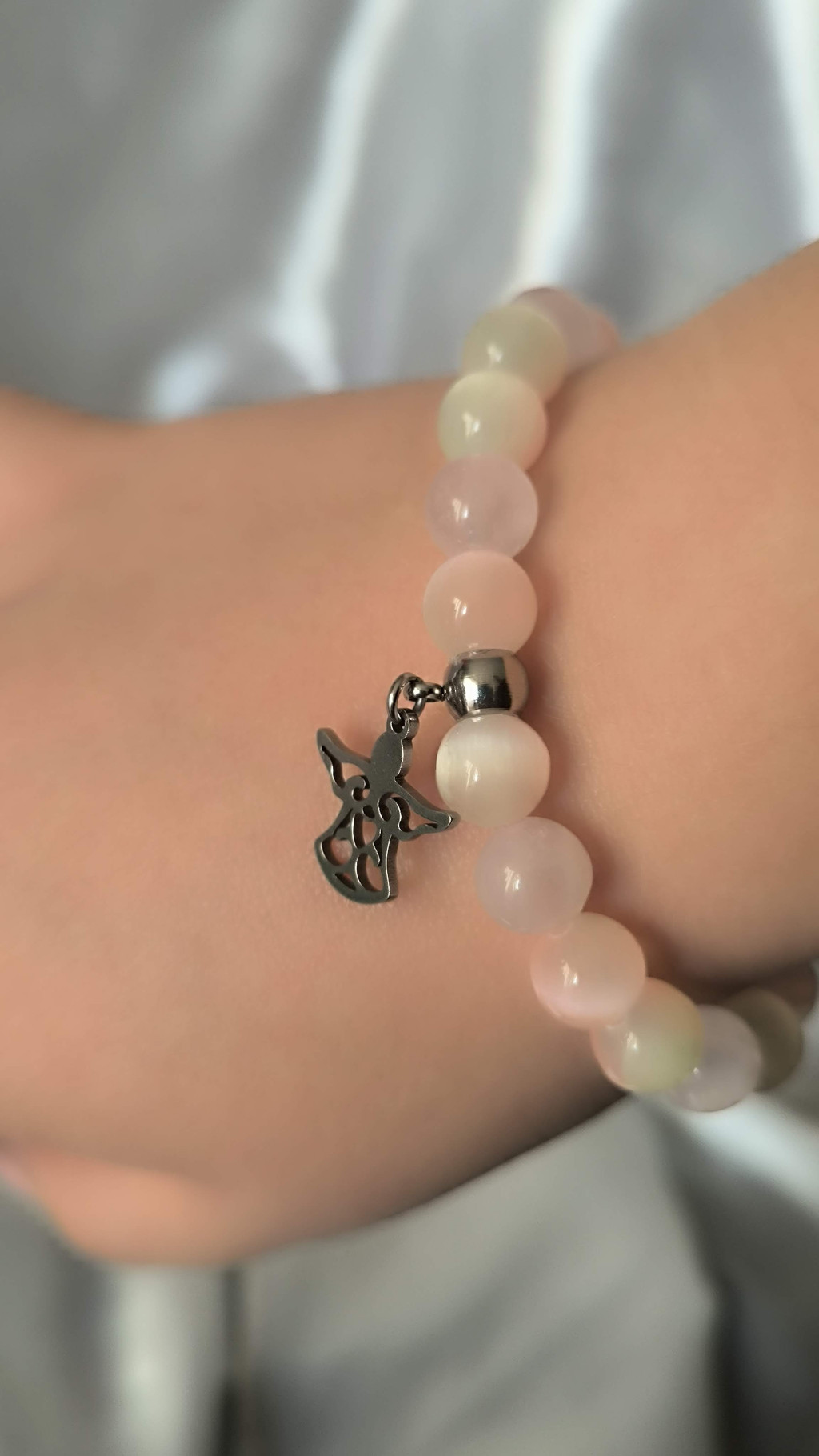 gyerek karkötő, színes szelenit karkötő, rózsakvarc gyerek karkötő, angyali medál karkötő, őrangyal karkötő gyerekeknek, Garuda Ékszer Susan Végh, különleges kézműves karkötő, lelki védelem karkötő